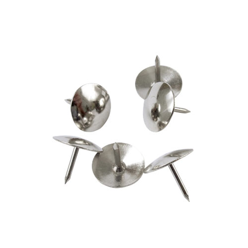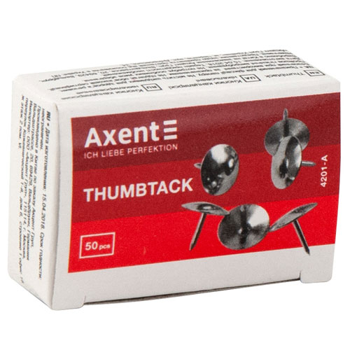 Никелированные кнопки серебряного цвета Axent 4201-A имеют круглую шляпку и тонкий заостренный стержень.