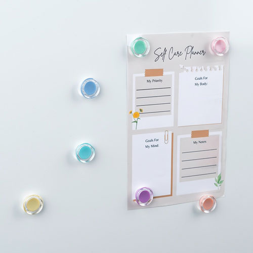 В наборе – 7 разноцветных круглых магнитов в пластиковом корпусе, упакованные в прозрачный блистер.